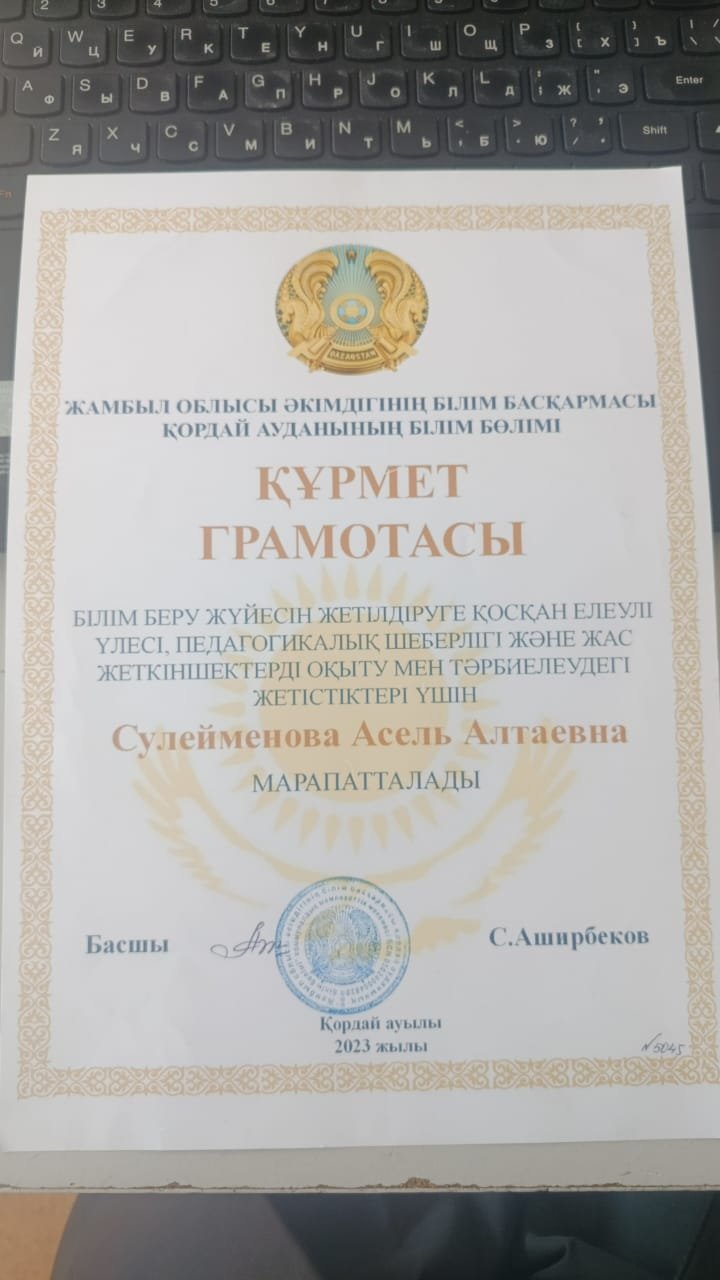 » » » "Білім беру жүйесін жетілдіруге қосқан елеулі үлесі үшін" құрмет грамотасы