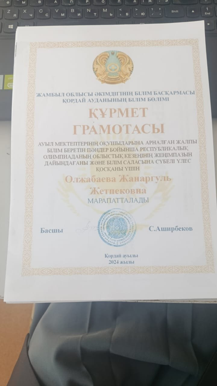 06 февраль 2024 0 1 2 3 4 5 "Ауыл мектептерінің оқушыларына арналған жалпы білім беретін пәндер бойынша республикалық олимпиада" құрмет грамотасы